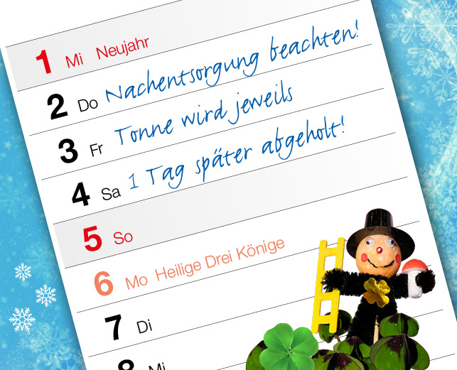 - Bitte die Zugänge zu den Abfallbehältern freihalten und andere Verkehrsteilnehmer durch die abgelegten Weihnachtsbäume und Reisigbündel nicht gefährden.